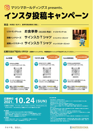 豪華景品が当たる「インスタ投稿キャンペーン」を開催いたします。当日展示されている車を撮影いただき、必要条件を揃えてインスタへ撮影した写真を投稿してください! 投稿いただいた方の中から抽選で3名様に、マツシマホールディングスが経営するイタリアン「リストランテt.v.b」のお食事券や選手サイン入りTシャツをプレゼントします!