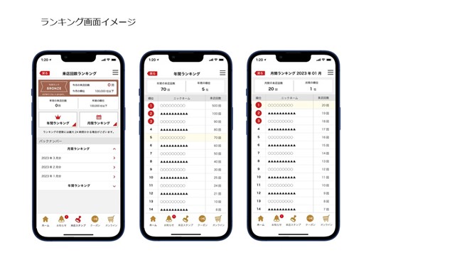 リニューアル後のアプリでは、月間/年間のご来店回数上位者に、特典がプレゼントされる“ランキング機能”を実装致します。※ランキング特典内容は現在検討中