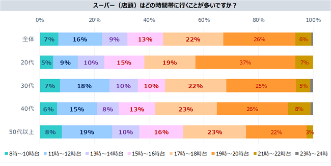 本調査ではこれ以外に、店頭、ネットスーパーで使用する平均金額や魅力に感じている点など全45問で回答を得て、年代別、性別、職業別、既婚・未婚別に集計しています。