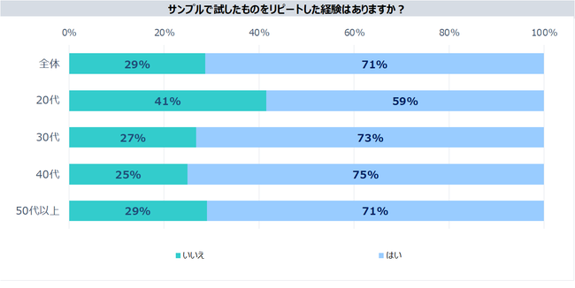 今回の調査結果では、コロナ禍であっても店頭スーパーの利用頻度は「変わらない」という結果になりました。「増えた」「減った」方は同じくらいの割合でおり、いずれもコロナウイルスによる影響で利用頻度に変化があったとしています。一方でネットスーパーの利用者は少ない結果となりましたが、コロナ禍で利用が増えたとする人は34%となりました。気になる調査結果として、店頭で配布されるサンプル品がきっかけで71%が購買につながっているとの回答がありました。実店舗でのサンプリングが高い確率で購買へとつながることがわかりました。