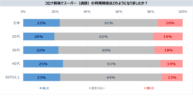 コロナ禍でスーパーの店頭利用は週に2~3回程度で19時~20時台が最も多く、コロナ前と比較して61%の方が利用頻度は「変わらない」と回答しました。利用が増えた方は16%、減った方は23%でした。増えた方は「自炊する機会が増えた」「巣ごもりするため」、減った方は「外に行くのは気が引けたため」「外出を減らすため」「まとめ買いをするようになったため」と、いずれもコロナによる影響であることがわかりました。