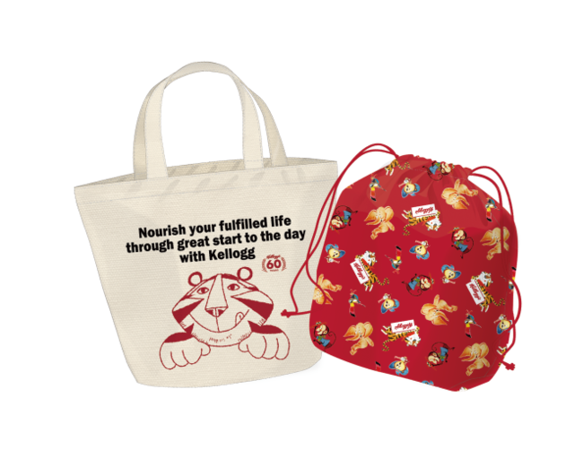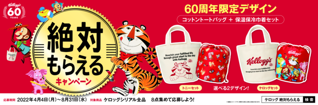 シリアル食品の世界シェアトップブランド「ケロッグ」を日本国内で展開する日本ケロッグ合同会社(本社:東京都千代田区、代表職務執行者社長:井上ゆかり)は、2017年のスタート以降、毎年大好評の「ケロッグ 絶対もらえるキャンペーン」を4月4日(月)よりスタートいたします。日本ケロッグが1962年の設立から60周年を迎えた今回の絶対もらえるキャンペーンは、記念すべき1年を彩る特別企画として、60周年の限定デザインのコットントートバッグと保温保冷巾着セットをご用意しました。日本ケロッグのシリアル全製品※が対象となり、購入レシートを撮影した点数を8点分ためて応募すると、絶対もらえます。※一部を除く