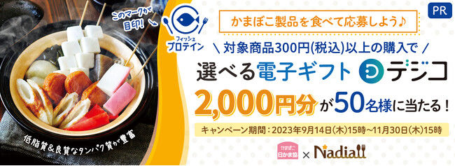 本キャンペーンは、かまぼこ製品に多く含まれている魚由来の良質なタンパク質「フィッシュプロテイン」を少しでも多くの方に知ってもらいたいという想いのもと両社で実施するもので、2023年9月14日(木)より、Nadia株式会社が運営するレシピサイトNadia上でキャンペーンページを公開しています。