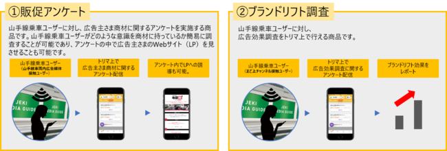 ○Jビーコン*2と、スイッチスマイルが提供する「pinable Ad*3」を連携させることにより、正確な山手線乗車判定を行うことができ、対象者(山手線乗車ユーザー)に対して、1.販促アンケート~LP誘導、2.ブランドリフト調査の2つのメニューを開発致しました。