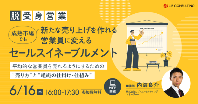 クライアントの売上向上を強みとする株式会社リブ・コンサルティング(本社:東京都千代田区、代表取締役:関厳)は、業績拡大に課題を感じている企業の幹部・企画部門の方を対象に営業活動を改善し、最適化するための概念や取り組みを叶えるオンラインセミナー「セールスイネーブルメント」を2022年6月16日(木)に開催します。