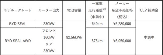 今回、日本に導入する「BYD SEAL」は、ベースモデルで後輪駆動の「BYD SEAL」と四輪駆動の「BYD SEAL AWD(ビーワイディー シール エーダブリュディー)」の1車種・2グレードです。全国メーカー希望小売価格は、BYD SEALが528万円(税込)、BYD SEAL AWDが605万円(税込)で、納車開始時期はBYD SEALが7月末ごろ、BYD SEAL AWDは8月末ごろを予定しています。ボディカラーは2グレード共通の全5色、内装色はブラックの1色です。なお、CEV補助金については、今後の同審議会で決定される予定です。