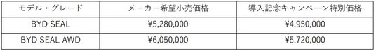 BAJでは、BYD SEALの国内販売開始に際し、長らく心待ちにされていたお客様への感謝の気持ちとして「1,000台限定:導入記念キャンペーン特別価格」を設定。本日から先行1,000台(※4)について、下記の特別価格を適用(※5)します。またこれと同時に、BYD SEALに快適にお乗りいただけるよう、期間限定で初期購入特典をプレゼントします。