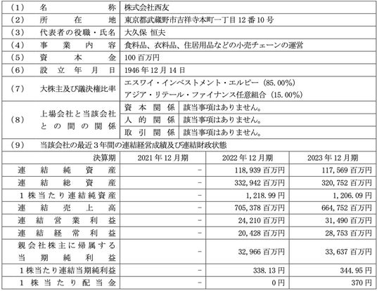 当社は、2025年3月5日開催の取締役会において、以下のとおり、株式会社西友(以下「西友」といいます。)の株式を取得し、完全子会社化することについて決議いたしましたので、お知らせいたします。