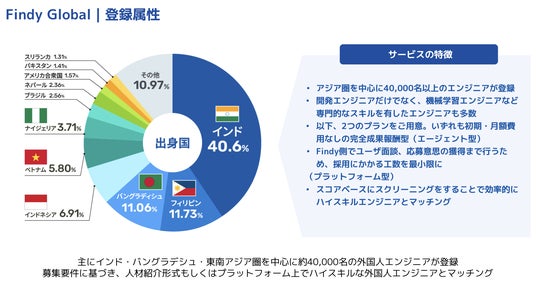 また、インドではIT教育が進んでおり、インドのエンジニアは、大学でコンピュータサイエンスを専攻して若い時からアルゴリズムなどの基礎をしっかり学んでいると言われています。2022年4月よりサービスを開始した当社のグローバルエンジニア採用プラットフォーム「Findy Global」においても、登録エンジニア約4万人のうち約40パーセントがインド国籍のエンジニアとなります。(※3)