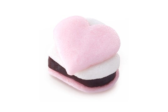 バレンタインにちなみ、ハート型の薯蕷(じょうよ)生地をかさねて、こしあんをはさみました。薯蕷とはいわゆるお饅頭の生地。しっとり、風味豊かなあじわいに、かさなる気持ちをあらわしました。