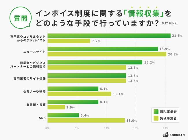 相違点は、「専門家やコンサルタントからのアドバイス」が、約3倍も課税事業者の方が多い(課税事業者は21.6%・免税事業者は7.2%)点と、「SNS」が、2倍以上も免税事業者の方が多い(課税事業者5.4%・免税事業者は13%)点です。