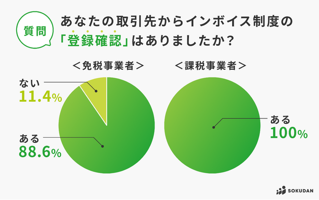 登録確認は、課税事業者が100%、免税も88.6%と両者とも高い