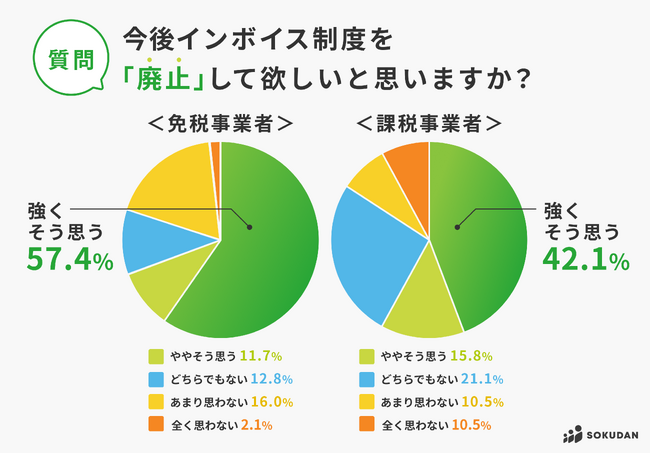 共通点は、「強くそう思う」「ややそう思う」を合計すると、免税事業者69.1%・課税事業者57.9%となり、半数以上が廃止して欲しいという結果になっている点です。