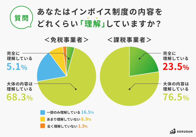 相違点は、「完全に理解している」の回答が、4倍以上も免税事業者より課税事業者の方が多い点です。(課税事業者23.5%・免税事業者5.1%)