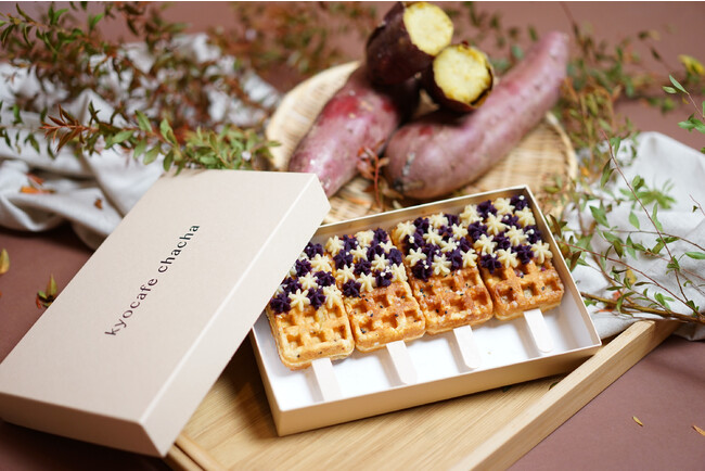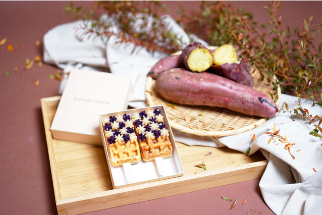 2022年9月5日(月)からは、紫芋とさつまいものペーストを贅沢に使用した「ホクホク!秋のあったか京ワッフル~さつまいもバター~」をkyocafe chacha嵐山店、kyocafe chacha三条店、kyocafe chacha公式WEBショップよりお買い求めいただけます。