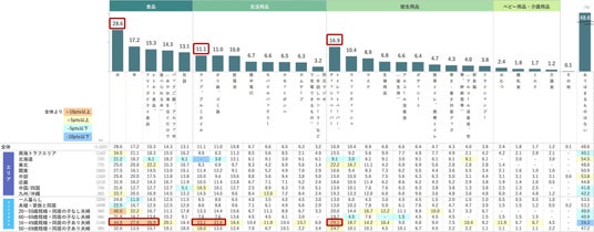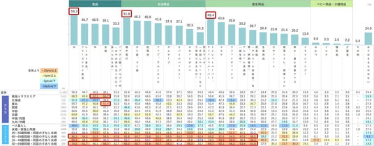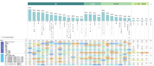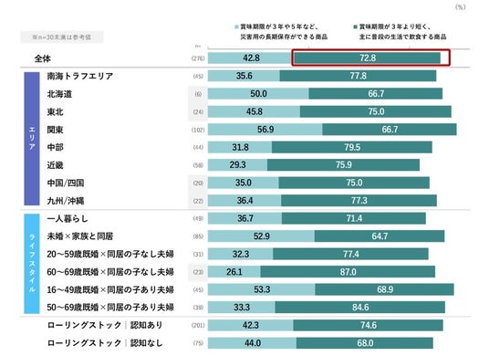 現在の実施状況は、東日本大震災の被害が大きかった東北が33.3% 、南海トラフエリアが33.1%と他のエリアに比べて高い。「ラップ、アルミホイル」「トイレットペーパー、ティッシュペーパー」等、日常生活で消費機会が多いものが上位に挙がる。食品では「賞味期限が短く、主に普段の生活で飲食する商品」の割合が高い結果になった。(長期保存できる商品の+30.1pts)。