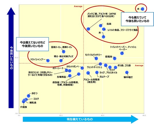 備えているものと今後買いたいものの関連を確認したところ、今も備えていて今後も買いたいものでは「水」が圧倒的に高く出ています。そのほか「缶詰」「レトルト食品、フリーズドライ食品」「米」「パックご飯、アルファ米」などの長期保存可能な食品が高くなっています。今は備えてないけれど今後買いたいものでは「簡易トイレ、携帯トイレ」「寒さ・暑さ対策グッズ」「ドライシャンプー」が高くなっています。特にドライシャンプーは昨今の猛暑の影響で見かける機会が増えた商品ですが、元は介護やキャンプ、被災時などお風呂に入れない時に使うものとして開発されたものでもあり再注目されているのではと考えられます。