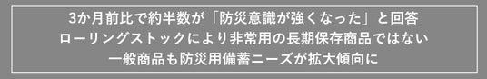 今回の調査では、地震や台風、記録的豪雨により3か月前と比較して防災意識の高まりが表れていました。ローリングストックの言葉の浸透の兆しが見られ、非常用の長期保存商品ではない一般商品にも防災用備蓄としてのニーズが広がっています。