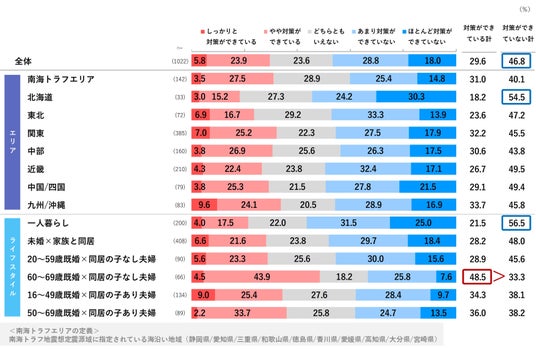 「南海トラフ地震臨時情報が発表されたことも影響し、南海トラフエリア(59.9%)と九州/沖縄(59.0%)で特に高くなっている。また、普段対策意識が薄い50代以下で防災意識の高まりが見られた。