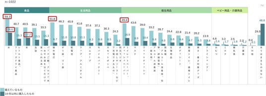 ローリングストックとして購入しているものは「賞味期限が短く、主に普段の生活で飲食する商品」の割合が高くなっています。(長期保存できる商品の+30.1pts)災害時の備蓄は長期保存ができる商品だけではなく、普段の生活で飲食する一般商品まで範囲が広がっている様子がうかがえます。