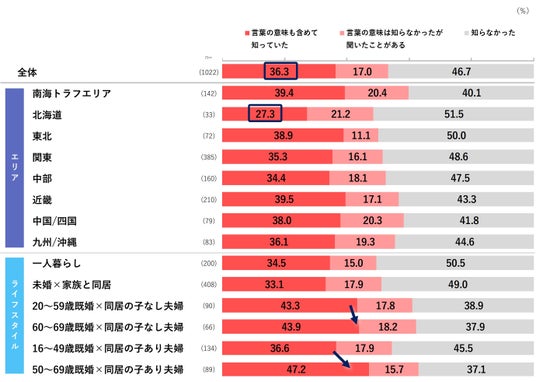 ローリングストックを「言葉の意味も含めて知っていた」と回答した割合は全体で36.3%にとどまり、「意味は知らなかったが聞いたことがある」まで含めると過半数を超えます。エリア別で最も認知率が低かったのは「北海道」で27.3%でした。地震や台風などの災害が少ない北海道は他エリアと比べて関心が低い結果となりました。ライフスタイル別では、年齢層が高いほうが認知率が高くなっていて、防災対策の実施状況とローリングストックの認知は比例していると考えられます。