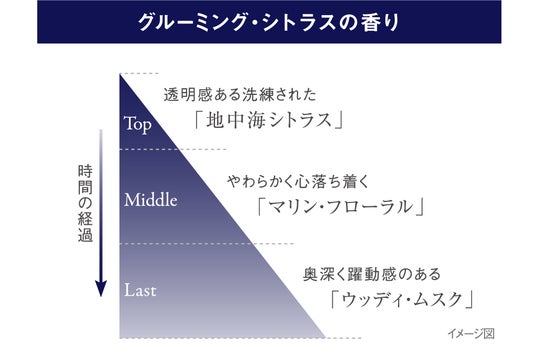 洗練された爽やかさと落ち着きを秘めた、グルーミング・シトラスの香り。透明感のあるフレッシュなシトラスに、奥深い余韻を残すムスクがほのかに香り、スキンケアが至福の時間に。