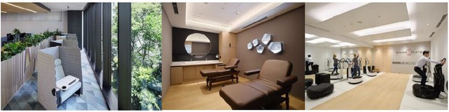 左より: ソロワークスペース、スパ トリートメントルーム、パワープレートスタジオ