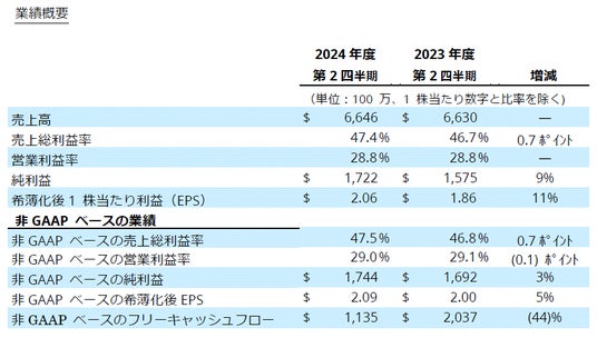 第2四半期の売上高は66億5,000万ドルでした。GAAPベースでは、売上総利益率47.4%、営業利益19億1,000万ドル(売上高の28.8%)、1株当たり利益2.06ドルでした。