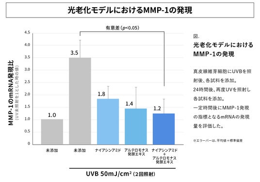さらに注目すべきポイントとして、ナイアシンアミドとアルテロモナス発酵エキスを併用した群においては、ナイアシンアミドのみを添加した群よりも高いMMP-1の発現抑制効果が認められました。この結果は、この両成分の組み合わせが、ナイアシンアミド単独使用よりも光老化に対して効果的にアプローチできることを示唆しています。