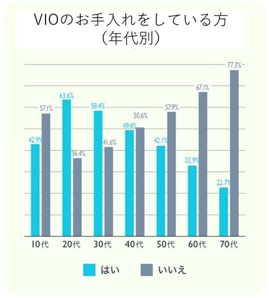 アンケート調査 によると、20代・30代では、およそ60%程度の方がVIOケアをしていると回答し、10代、そして40代・50代でも40%以上がVIOをケアしていることがわかりました。