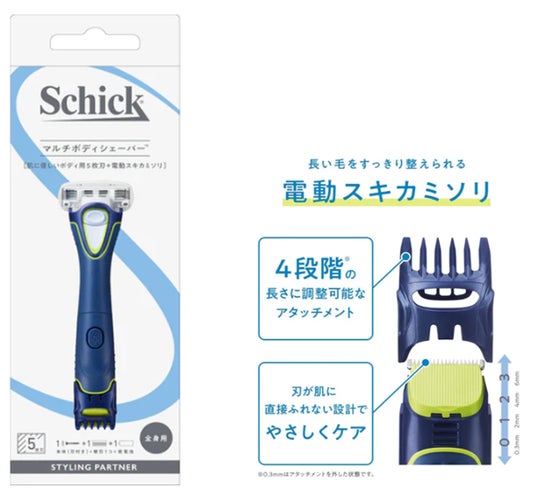 肌に優しい設計の5枚刃カミソリと、電動スキカミソリが一体型となった1本で2機能を兼ね備えたボディ用シェーバー。
