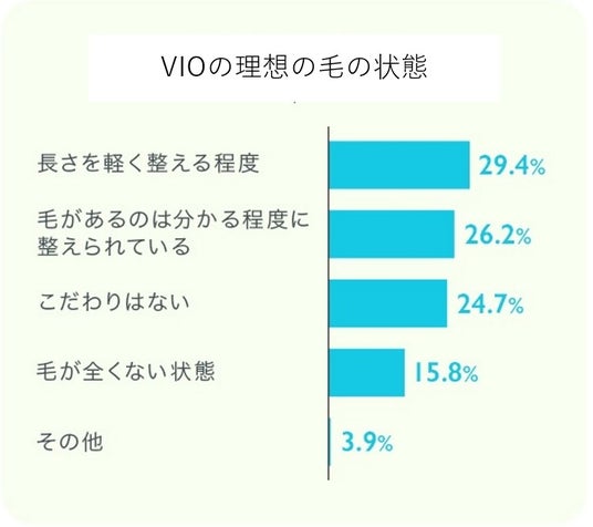 ■VIOは“ツルツル派”より、長さを軽く整える“整え派”が多数!全く毛のない状態にしたい、というよりは身だしなみの一環として毛が整えられている状態を理想とする人が多く、VIOの理想の 状態について、「長さを軽く整える程度」(29.4%)が最も多く、次に「毛があるのは分かる程度」(26.2%)と長さを整える“整え派”が半数を超える結果となりました。反対に「毛が全くない状態」を理想の状態と回答した方は約15%と“整え派”の半数以下でした。