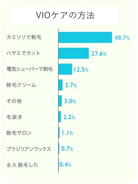 普段行うVIOケアの方法についての質問では、カミソリを使用していると回答した方が全体の48.7%との約半数を占めました。2番目に多かったのは「ハサミでカット」、 次いで「電気シェーバーで剃毛」とご自身の好みで長さや形を整えることができるセルフケアが中心となっています。