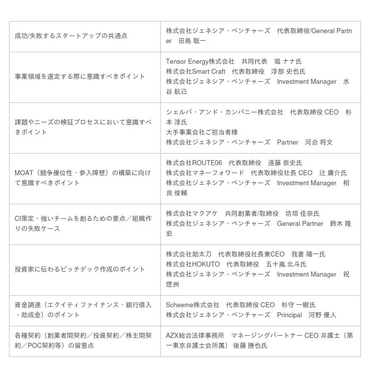 本プログラムは、『産業創造プラットフォーム』の構築をミッションに掲げるジェネシア・ベンチャーズが、累計130社(※2023年2月時点)を超える創業期のスタートアップに投資・伴走してきた中で得てきた実践的な知見や投資先起業家の実体験を共有することで、事業成長のための最短距離を提示するとともに、あらゆる垣根を越えたコミュニティ形成を促進することで、日本のスタートアップエコシステム全体の底上げを目指して実施するものです。