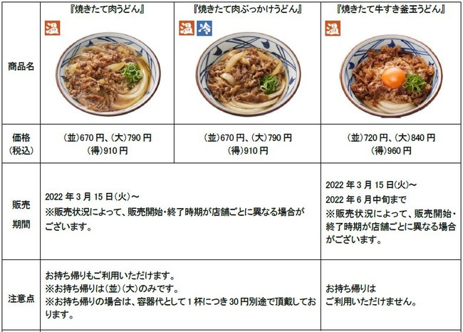 株式会社丸亀製麺(本社:東京都渋谷区、代表取締役社長:山口 寛)が展開する讃岐うどん専門店「丸亀製麺」は、打ち立て茹でたてのうどんだけでなく、牛肉やたまねぎの焼きたてのおいしさを味わっていただきたく、できたてを極めた『焼きたて肉うどん』を2022年3月15日(火)から全国の丸亀製麺にて販売開始いたします。さらに、人気の『牛すき釜玉うどん』もさらにおいしくなって期間限定で復活販売いたします。焼きたての牛肉と濃厚な玉子がもちもちの麺に絡み合う一杯をご賞味ください。