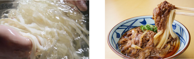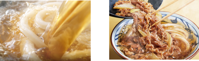 味付けは、醤油ベースにだしの風味を感じるすっきりとした甘さが特徴の特製の割り下で牛肉とたまねぎを焼き上げます。すべての店で毎日国産100%の小麦粉からつくる打ち立てうどんのもちもち食感や小麦の風味、だしの旨みや焼きたての牛肉とたまねぎの旨みが調和する相性抜群の一杯です。
