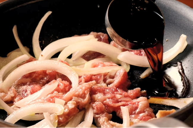 【こだわり2.】 焼きたて牛肉とたまねぎが約1.4倍 増量!