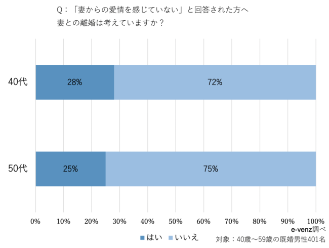 40代が28%・50代の25%が「離婚を考えている」と答えています。