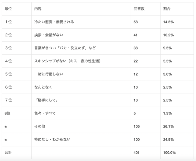 1位が「冷たい態度・無視される」で14.5%、2位「挨拶・会話がない」10.2%・3位「言葉がきつい」9.5%がトップ3でした。
