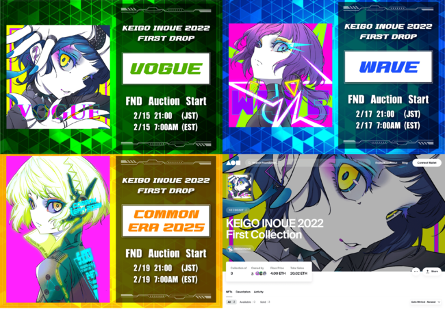 国内トップアーティストである、「Ado」「Eve」「Kizuna AI(キズナアイ)」らとコラボレーションを実施してきた、最先端を走るアーティスト「ケイゴイノウエ」。その、ケイゴイノウエのアート連作企画「KEIGO INOUE 2022 First Collection」の3作品「VOGUE」「WAVE」「COMMON ERA 2025」の3作品が、世界規模のNFTマーケットFoundationへ出品され、20.02 イーサリアム(ETH)日本円換算 約606万円で落札される快挙を達成。ケイゴイノウエのNFT作品の落札総額は63.7348 イーサリアム(ETH)となった。
