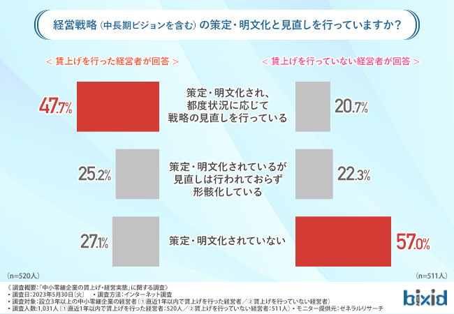 そこで、賃上げを行った方に「経営戦略(中長期ビジョンを含む)の策定・明文化と見直しを行っていますか?」と質問したところ、『策定・明文化され、都度状況に応じて戦略の見直しを行っている(47.4%)』『策定・明文化されているが見直しは行われておらず形骸化している(25.2%)』『策定・明文化されていない(27.1%)』という回答結果になりました。