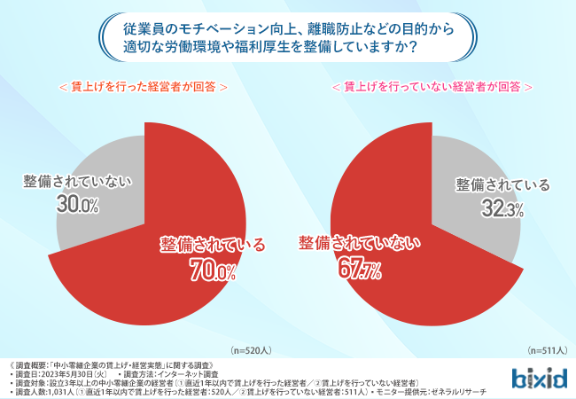 一方、賃上げを行っていない方は『整備されている(32.3%)』『整備されていない(67.7%)』という回答結果になり、賃上げを行っていない方の方が労働環境や福利厚生を整備していないようです。