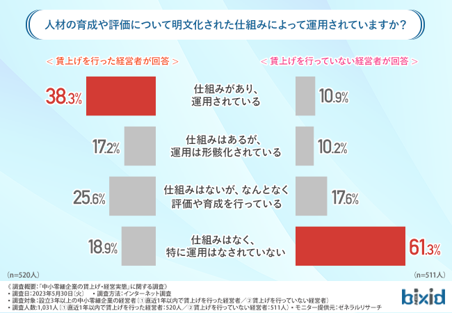 賃上げを行った方に、「人材の育成や評価について明文化された仕組みによって運用されていますか?」と質問したところ、『仕組みがあり、運用されている(38.3%)』『仕組みはあるが、運用は形骸化されている(17.2%)』『仕組みはないが、なんとなく評価や育成を行っている(25.6%)』『仕組みはなく、特に運用はなされていない(18.9%)』という回答結果になりました。