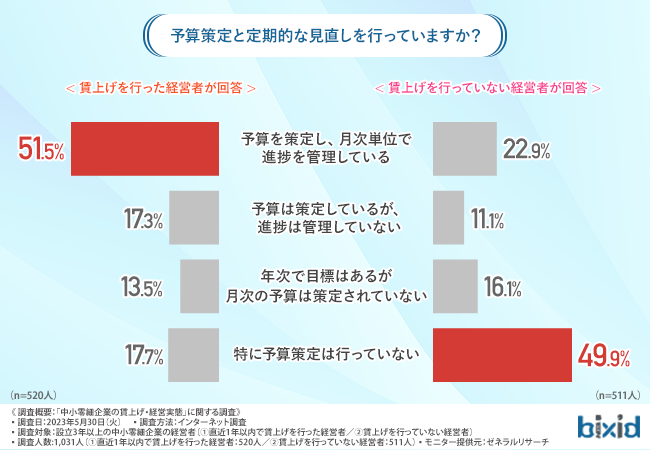 一方、賃上げを行っていない方は『予算を策定し、月次単位で進捗を管理している(22.9%)』『予算は策定しているが、進捗は管理していない(11.1%)』『年次で目標はあるが月次の予算は策定されていない(16.1%)』『特に予算策定は行っていない(49.9%)』という回答結果になり、賃上げを行っていない方のほうが予算策定などを行っていないようです。
