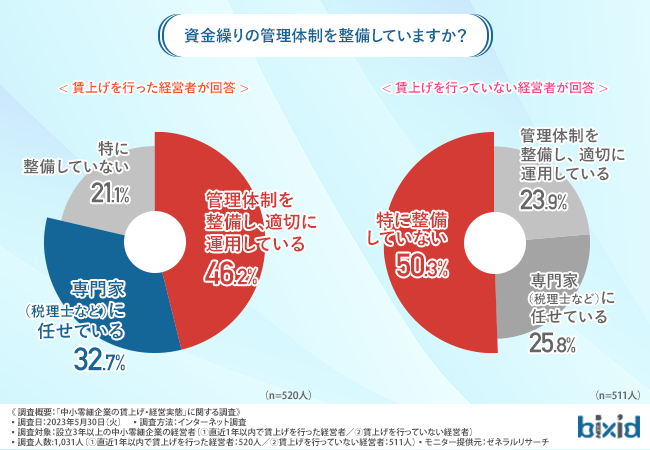 一方、賃上げをしていない方は『管理体制を整備し、適切に運用している(23.9%)』『専門家(税理士など)に任せている(25.8%)』『特に整備していない(50.3%)』という回答結果になり、管理体制を整備していない方が半数以上いることがわかりました。