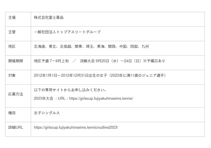 ・「富士薬品セイムス ガールズカップ」URL:https://girlscup.fujiyakuhinseims.tennis/