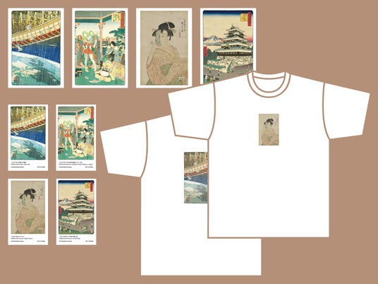 これまで「千代田細見」に掲出した、しりあがり寿さんの浮世絵パロディ作品のグッズを数量限定で販売いたします。グッズはTシャツ、ポストカード、ステッカーの3品。千代田区観光案内所にてご購入いただけます。