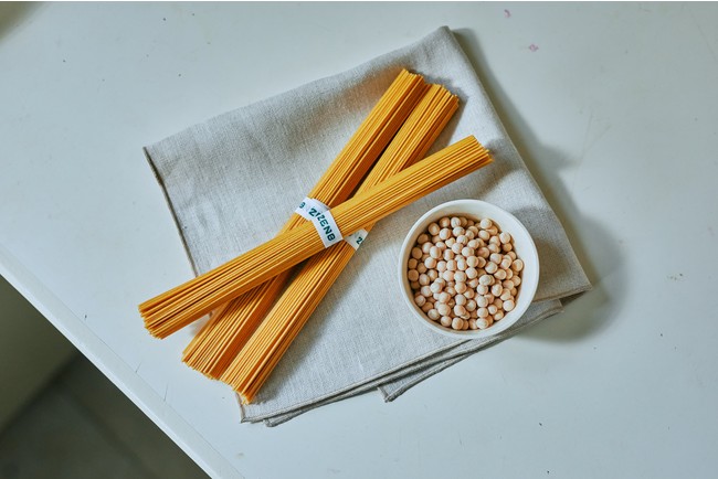 ほのかな旨みともちっとした食感が魅力の黄えんどう豆100%の麺です。食物繊維や植物性たんぱく質が豊富な黄えんどう豆をうす皮までまるごと使っており、いつものパスタやうどん、中華麺、ごはんと比べて糖質は30%オフ※1。パスタや汁麺、まぜ麺、焼きそばなど、どんな料理にも自由に使えて、毎日おいしく食べ続けられる新しい主食です。さらに、麺だけでなく、ゆで汁にも豆の旨みや栄養が溶け出しており、スープにすれば、豆のおいしさを余すことなく味わえます。