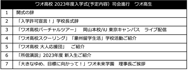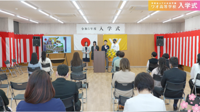 激動の時代を生き抜く力を、実学と教養によって育む、学校法人ワオ未来学園ワオ高等学校(本校所在地岡山県岡山市 校長山本潮)(以下ワオ高校)は、2021年4月開校の最も新しい学校として未来型の学びを提供しています。今年、三年目の新入生を迎えるにあたり、バーチャルキャンパス(oVice校舎)、岡山本校、情報経営イノベーション専門職大学(iU)内 東京キャンパスを繋いで、ハイブリット型の入学式を、4月8日(土)に挙行しました。今年のワオ高校の入学式は、企画段階からワオ高生が参加し、当日は、司会進行を生徒の代表が立派に務め上げました。新入生たちの所信演説として、ワオ高校で頑張りたいことや将来の夢を紹介。制服&慣例なし、生徒たち自身で自由と自立を体現する、ワオ高校らしい、ワオ!な入学式でした。