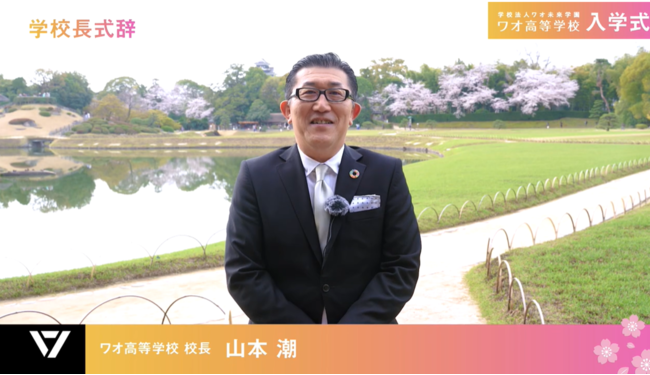 世界に誇る文化財、日本三名園の一つ、岡山後楽園の美しい桜をバックに、ワオ高校学校長 山本潮より、お祝いのメッセージとして、新入生に次の3つの言葉を届けました。